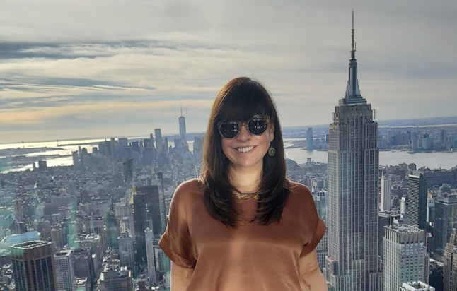 Author Marcela Gómez at a high rise in NYC with the Empire State building in the back.